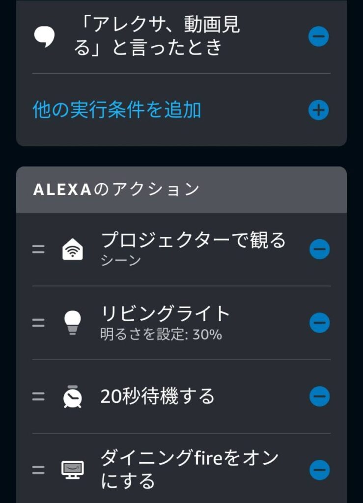 このシーンとアレクサの定型アクションを組み合わせ、「動画観る」と言うだけで①~⑤が実行されます。