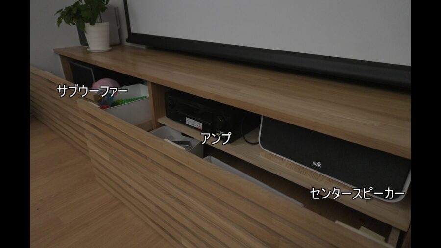 センタースピーカーやフロントスピーカーは視聴者の耳の高さに配置するのが理想とされていますが、スクリーンが下りてくる関係上、センタースピーカーはスクリーンの下の収納の中に配置しています。